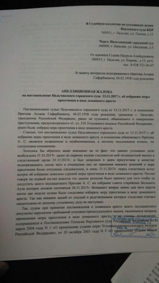 «Считаю, что постановление судью Нальчикского городского суда от 13 ноября в отношении Иритова Аслана является незаконным и необоснованным, а поэтому подлежащим отмене, говорится в апелляционной жалобе», — подданной 15 ноября в Судебную коллегию по уголовным делам Верховного суда Кабардино-Балкарии